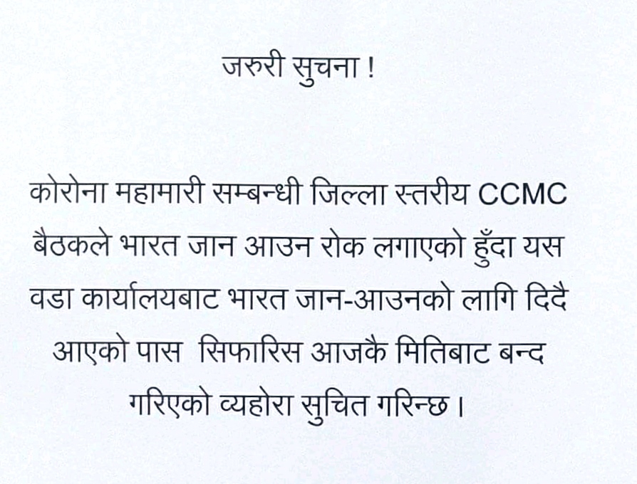 इन्चार्ज गिरी अनुसार नेपाली नागरिक लाई बिना पास अथवा वार्डको सिफारिस बिना जान नदिने र भारतिय आधार कार्ड भएको लाई जानदिने ।