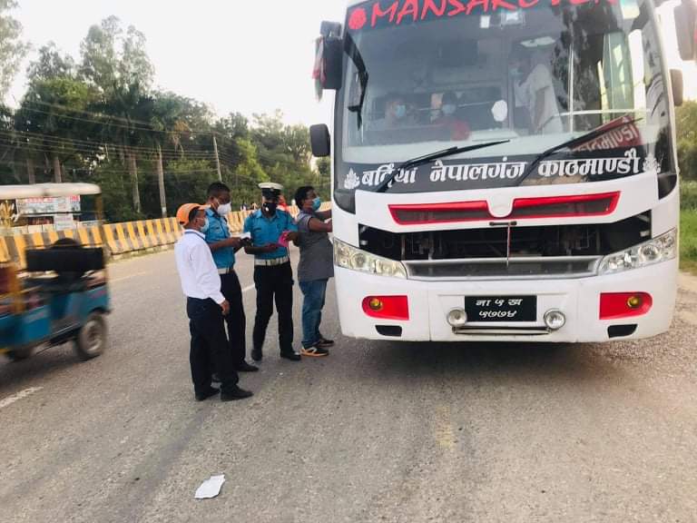 अधिकृत छैठाै मधुकर जंग शाह यातायात व्यवस्था कार्यालय नेपालगंज बाँके र प्रनानि सिद्धिगणेश शाह अस्थायी ट्राफिक प्रहरी पाेष्ट बसपार्ककाे संयुक्त टाेलिले।यसरी व्यवस्था नगरेका गाडी हरूलाई न्युनतम जरीवाना गरि सम्झाई बुझाई अब उपरान्त नियम पालना गर्ने शर्तमा छाेडिएकाे छ ।