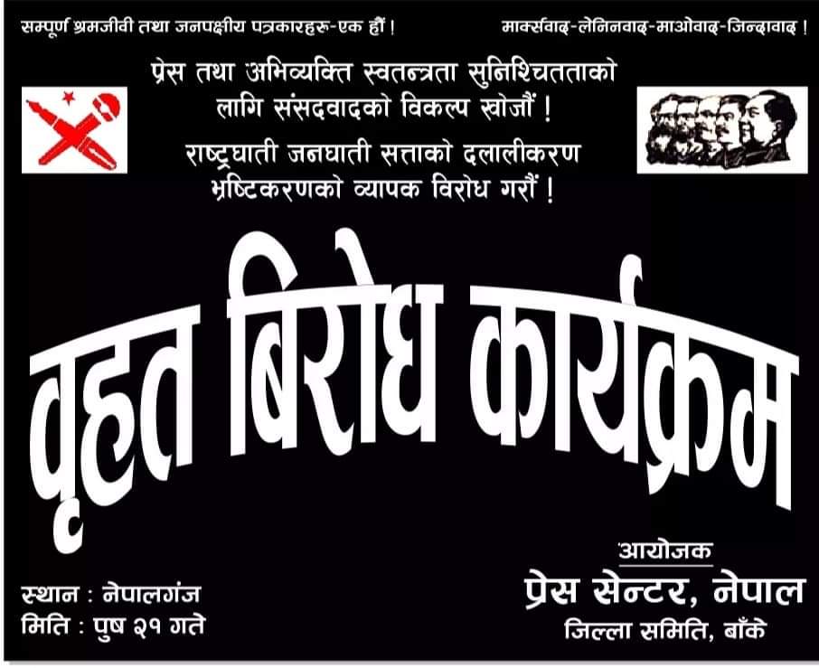 प्रेस सेन्टर नेपाल् बाँकेले सोमबार पत्रकार सम्मेलन मार्फत बिरोध कार्यक्रमको बारे जानकारी गराएको छ । उक्त बिरोध कार्यक्रममा सम्पूर्ण देशभक्त पत्रकार, सञ्चारकर्मि लेखक, बुद्दिजीवी, पेशाकर्मिहरु र आम नागरिकको समस्या तथा दलाल प्रतिक्रियावादी राज्यसत्ताँको विकल्पबारे सञ्चारकर्मि र सचेत नागरिकहरुको संयुक्त कार्यक्रमको जानकारी गराउदै सम्पूर्णलाई सहभागी हुनका लागी प्रेस सेन्टर नेपाल बाँकेका अध्यक्ष अजय पाठकले आग्रह गरेका छन ।