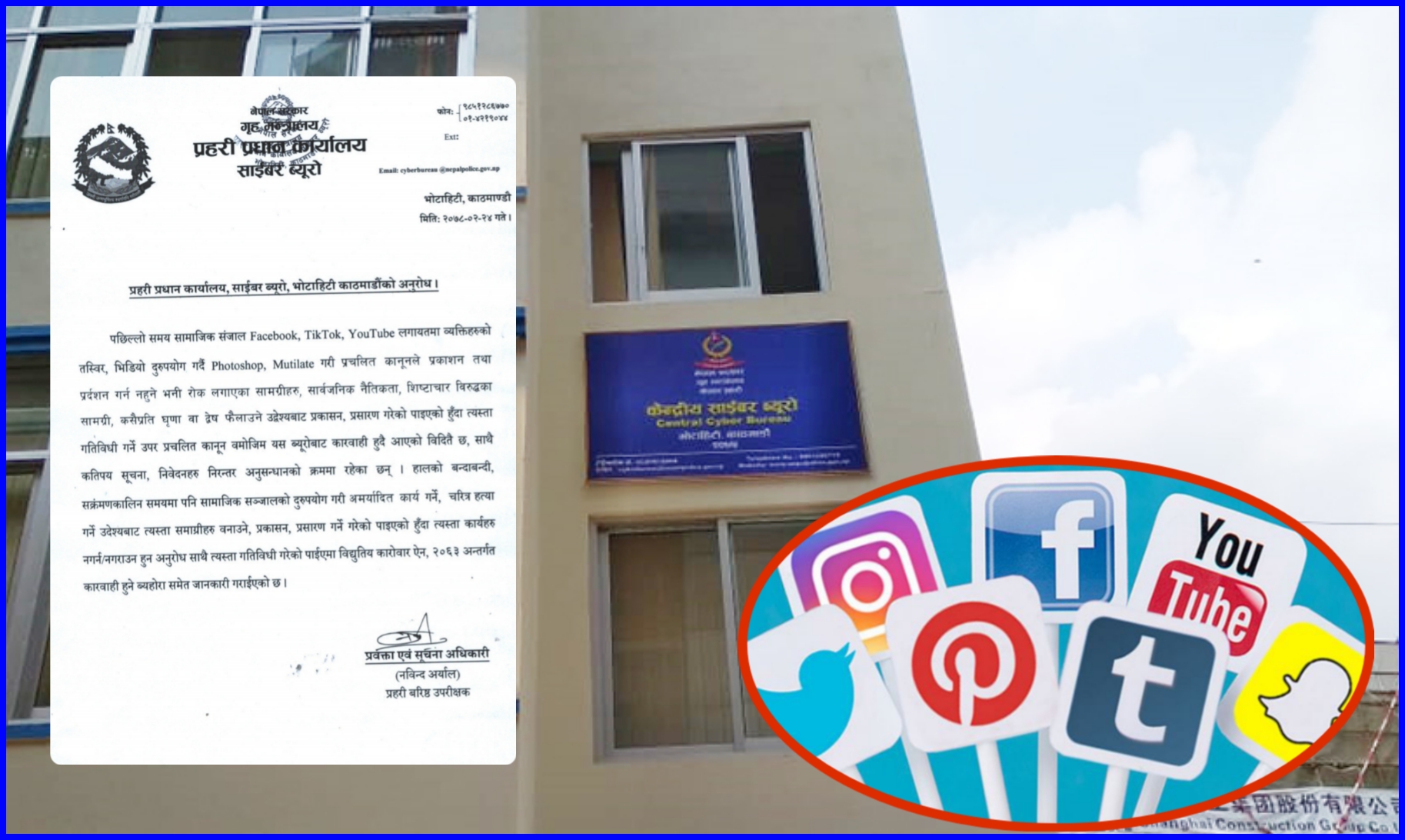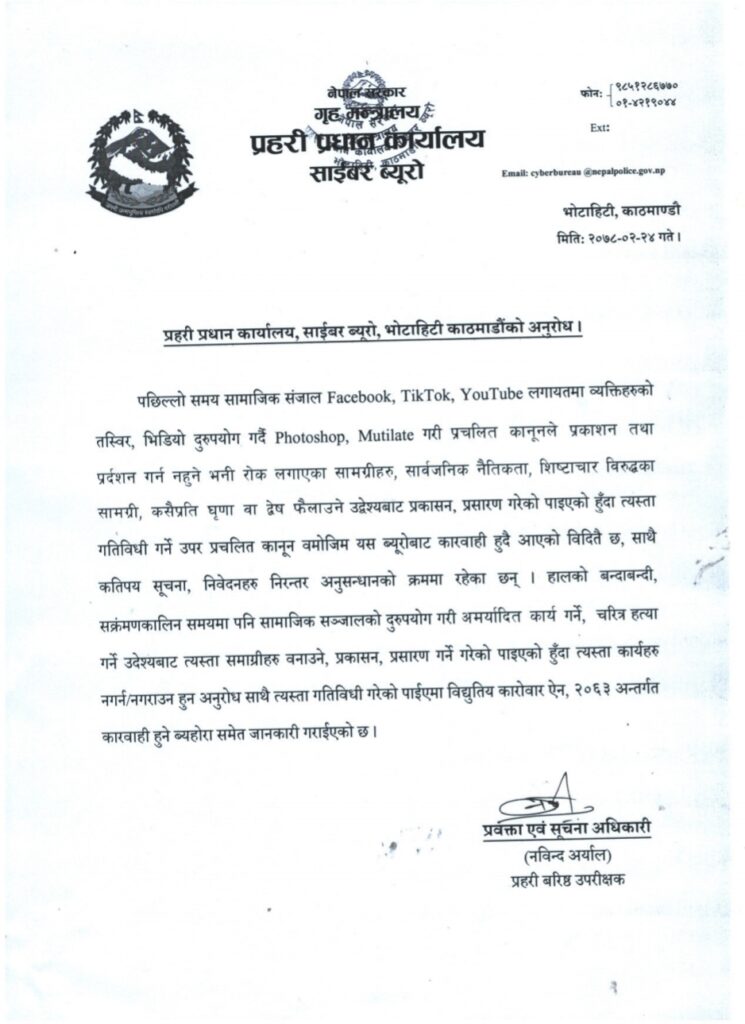 सामाजिक सञ्जाल फेसबुक, टिकटक, युट्यूबलगायतमा व्यक्तिको तस्बिर, भिडियो दुरुपयोग गर्दै प्रचलित कानुनले प्रकाशन तथा प्रदर्शन गर्न रोक लगाएका सामग्री सार्वजनिक नैतिकता, शिष्टाचारविरुद्धका सामग्री कसैप्रति घृणा वा द्वेष फैलाउने उद्देश्यबाट प्रकाशन, प्रसारण गरेको पाइएमा विद्युतीय कारोवार ऐन, २०६३ अन्तर्गत कारवाही हुने ब्यूरोको विज्ञप्तिमा जनाइएको छ । साथै, त्यस्ता गतिविधि गर्नेउपर प्रचलित कानुनबमोजिम ब्यूरोबाट कारवाही हुँदै आएको र कतिपय सूचना, निवेदनहरु निरन्तर अनुसन्धानको क्रममा रहेकोसमेत ब्यूरोले जानकारी गराएको छ ।