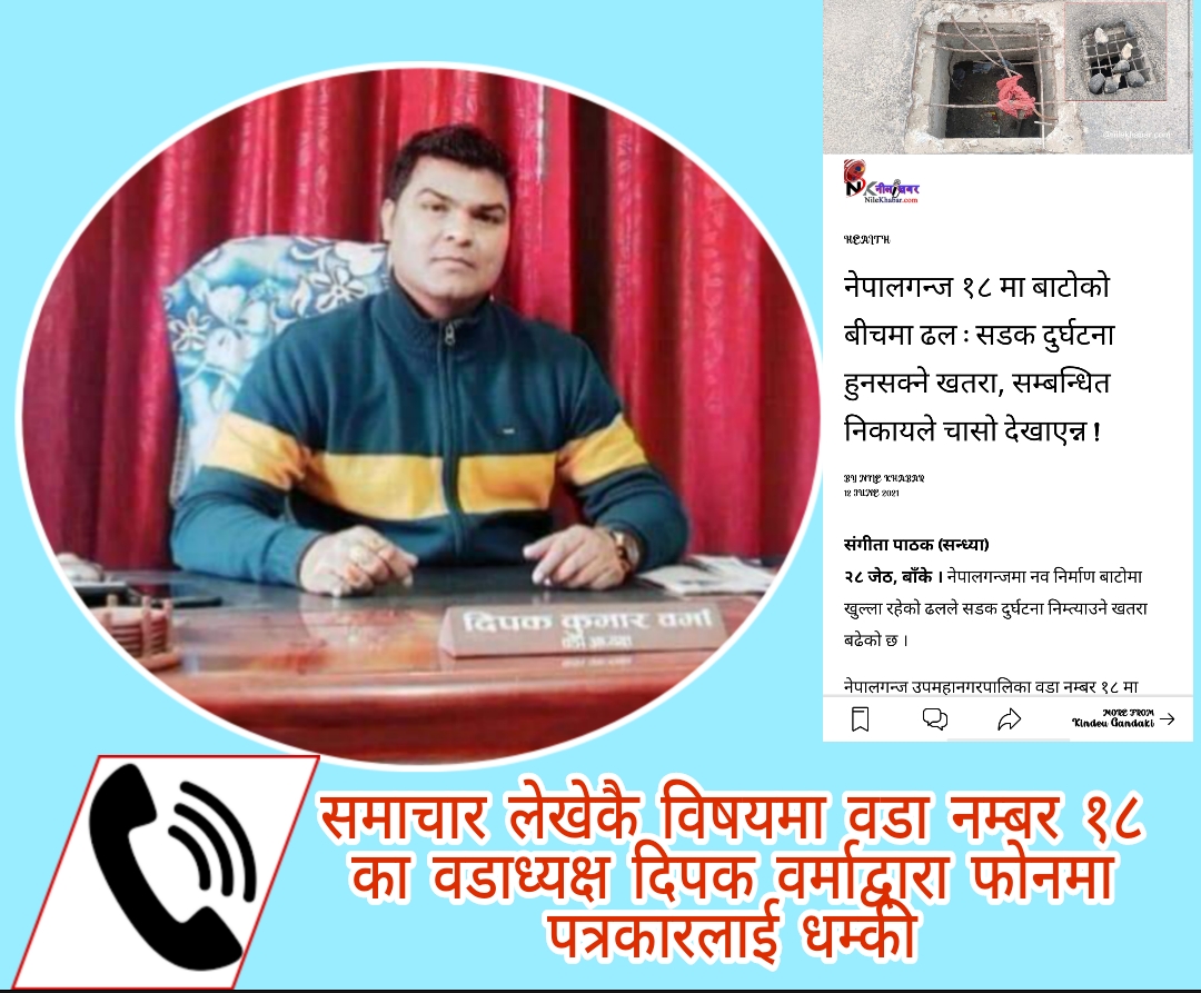 २९ जेठ, बाँके । नेपालगन्ज उपमहानगरपालिका वडा कार्यालय नम्बर १८ मा बाटोको ठिक बीचमा रहेको ढलको विषयमा समाचार लेखेपछि वडाध्यक्ष दिपक वर्माले फोन गरेर पत्रकारलाई धम्क्याएका छन ।