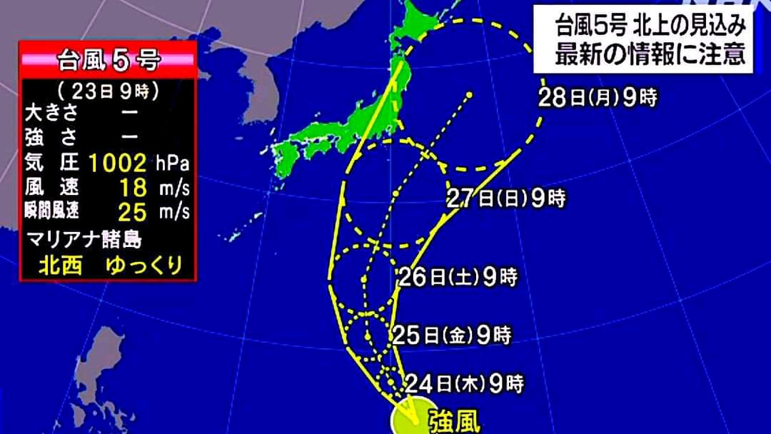 जापानमा जुन २३ तारिख बिहान यस मौसमको पाचौं ताईफु मारिआना द्धिप नजिक उत्पन्न भएको छ । जापानको दक्षिणी भागमा बुधवार बिहान ९ बजे देखा परेको ताईफु राजधानी टोकियो नजिक हुँदै अघि बढ्ने देखिएको छ ।