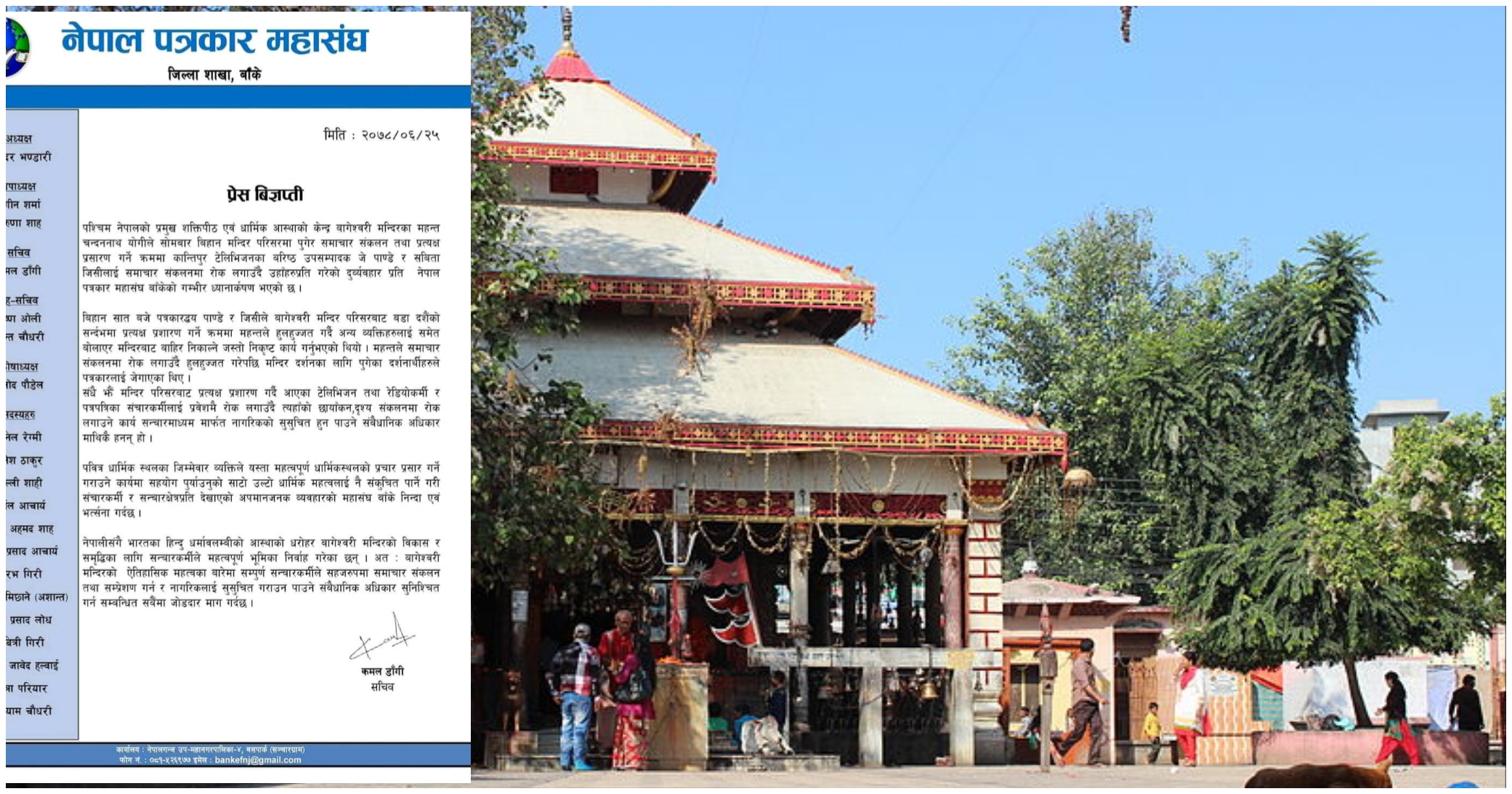 बाँकेको नेपालगञ्ज स्थित पश्चिम क्षेत्रकै प्रशिद्ध शक्तीपीठ बागेश्वरी मन्दिरमा समाचार संकलन गर्न रोक लगाइएको छ । मन्दिरका मुल महन्त चन्द्रनाथ योगीले समाचार संकलन गर्न गएका पत्रकार तथा पत्रकारिता पेशालाई अश्लील शब्द प्रयोग तथा दुर्वयवहार गर्दै रोक लगाएका हुन ।