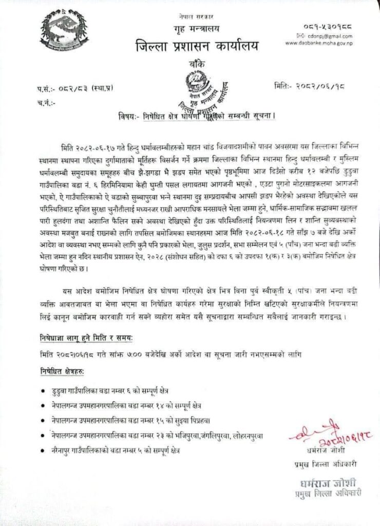 शुक्रबार दुर्गा मूर्ति विसर्जनका क्रममा हिन्दु र मुस्लिम समुदायबीच झडप भएको पृष्ठभूमिमा शनिवार पनि मध्यान्ह १२ बजेपछि डुडुवा गाउँपालिका वडा नम्बर ६ हिरमिनियाका केही घुम्ती पसलमा आगजनी गरिएको, एउटा पुरानो मोटरसाइकल आगजनी गरिएको र वडा नम्बर ६ कै सुब्बापुरुवा भन्ने स्थानमा झडप समेत भएको अवस्थालाई मध्यनजर गर्दै उल्लेखित क्षेत्रहरुमा पाँच जना भन्दा बढी भेला हुन नपाउने गरी निषधाज्ञा जारी गरिएको जिल्ला प्रशासन कार्यालय बाँकेले जनाएको छ ।